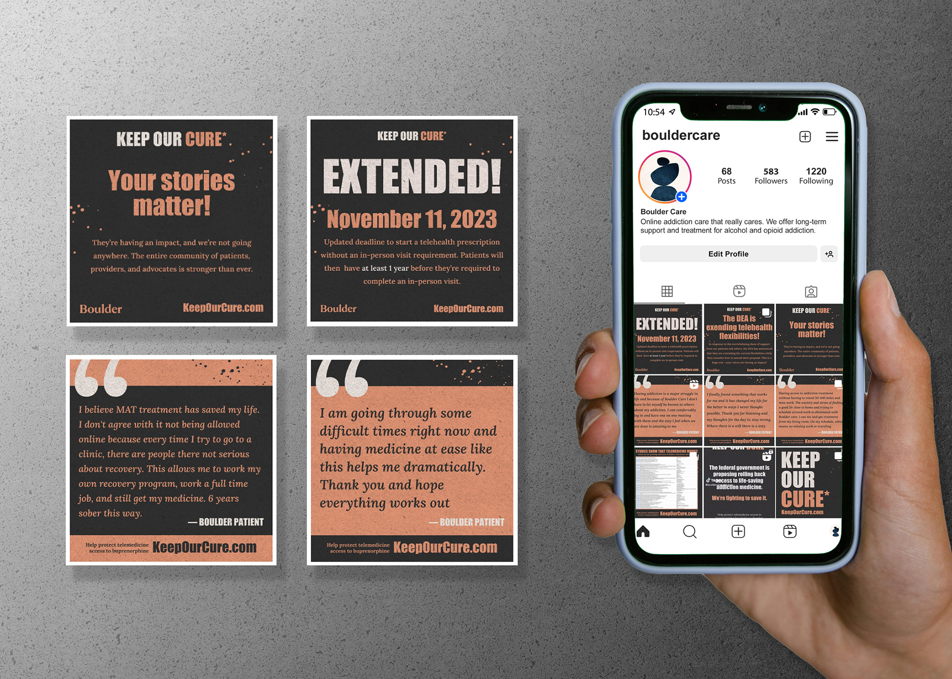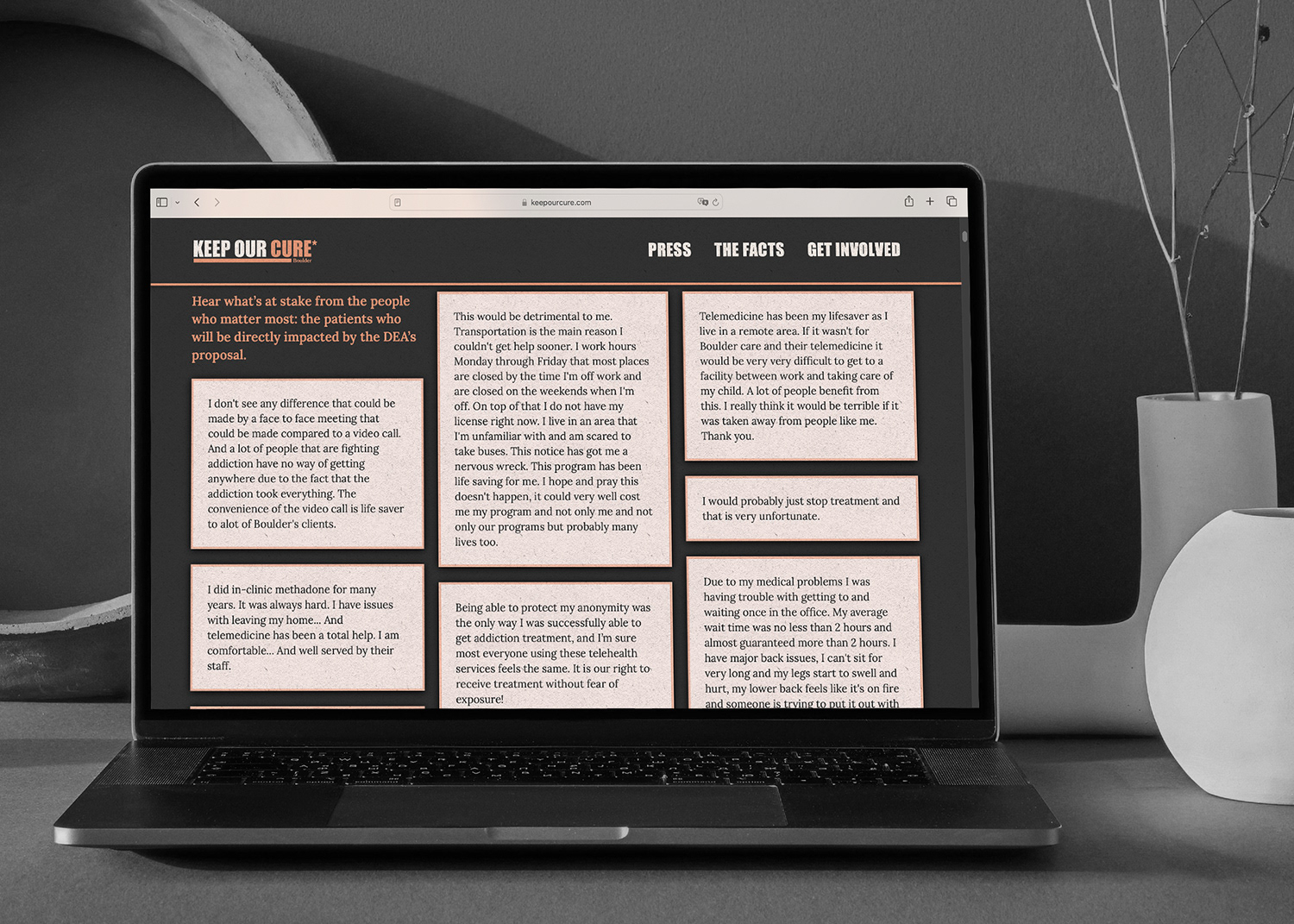 At Boulder Care, we started the Keep Our Cure campaign to get our patient's voices heard in the face of a DEA ruling that threatened to remove telehealth access for people who relied on medication assisted treatment (MAT) for Opioid Use Disorder. The DEA received over 35,000 comments on the issue. Keep Our Cure directed patients to action, and provided a space to leave public comments in the fight for more personal control over recovery from addiction.